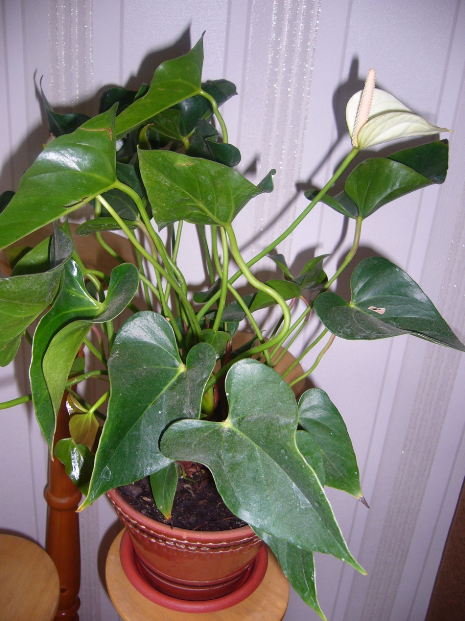 Листья у антуриума кожистые, с высокими черешками, имеют глянцевую поверхность. Цветки имеют крупные прицветники и высокие черные цветоносы. Форма соцветия – початок желтого или розового цвета. Сами цветки не имеют декоративную ценность, они невзрачные и мелкие. Прицветник – покрывало имеет блестящую поверхность, расположен под початком. Покрывало окрашено в яркие цвета: розовый, нежно – зеленый, голубой, белый, наиболее часто встречаемый цвет – красный. Температура воздуха для антуриума должна быть высокой. Зимой температура должна быть не ниже 180 С. Необходимо регулярно проветривать помещение, но при этом защищать антуриум от сквозняков. Полив в летний период необходим в умеренном количестве, в зимний период он должен быть скудным. Нельзя допускать пересыхание почвы. Для полива используется мягкая вода комнатной температуры. Листья растения должны быть всегда чистыми. Листья протирают влажной мягкой тряпочкой и наносят слой специального воска. Несколько раз в год необходимо тщательно мыть антуриум под душем, при этом на горшок надевают полиэтиленовый пакет во избежание переувлажнения почвы.